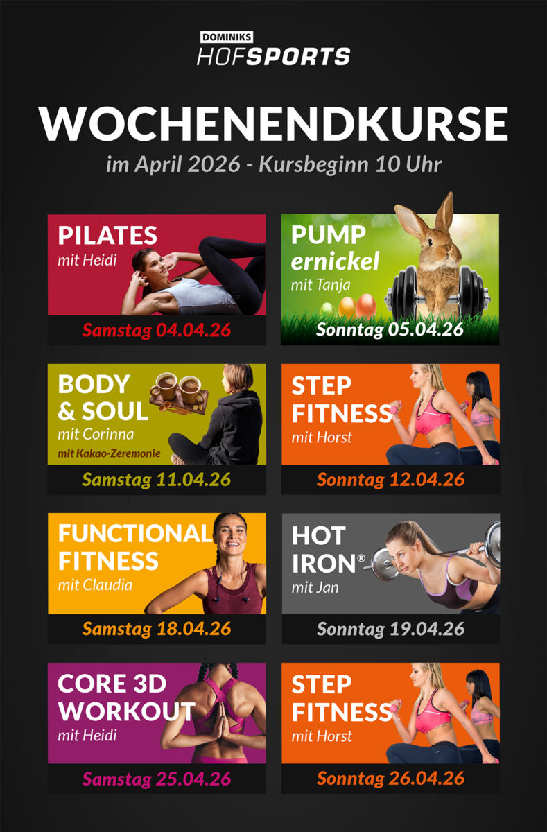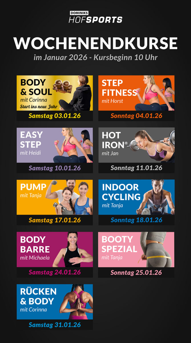 Alle Kurse finden in DOMINIKS Fitnessstudios HofSports und / oder Lady-Sports statt.